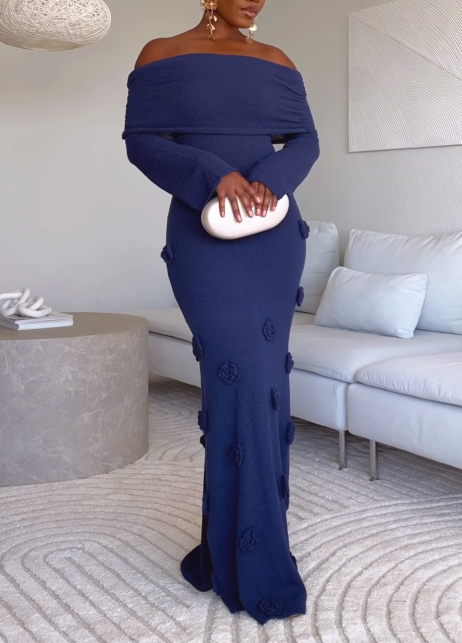 The Off Shoulder Knit Rose Maxi Dress exudes timeless sophistication. With an off-shoulder neckline and long sleeves, this bodycon dress beautifully contours the silhouette. The delicate flower applique adds a touch of romance, while the lightweight knit fabrication ensures a comfortable fit. Designed in a maxi length, this is a refined choice for your next rendezvous.